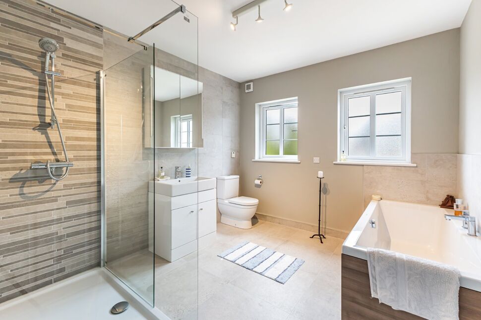Duravit luxury bathroom suite comprising bath with mixer tap, vanity unit, low flush WC, walk-in fully tiled shower cubicle with built-in shower, ceramic tiled floor, heated towel rail, part tiled walls.