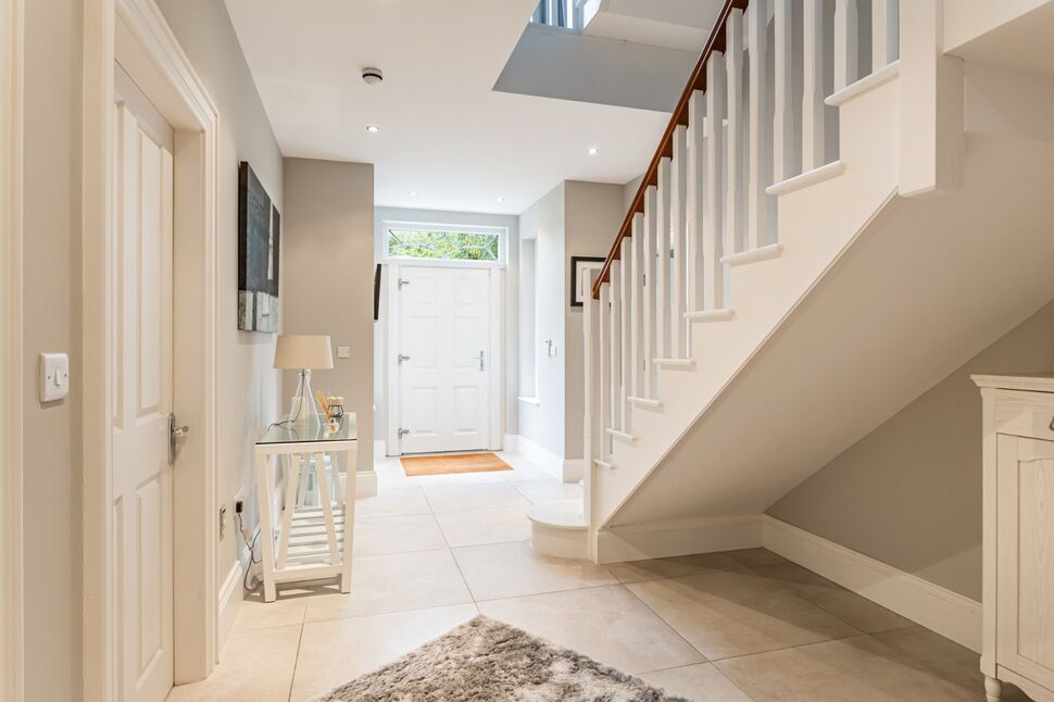 Hardwood front door with top lights, tiled floor, under stairs storage area, low voltage lighting.