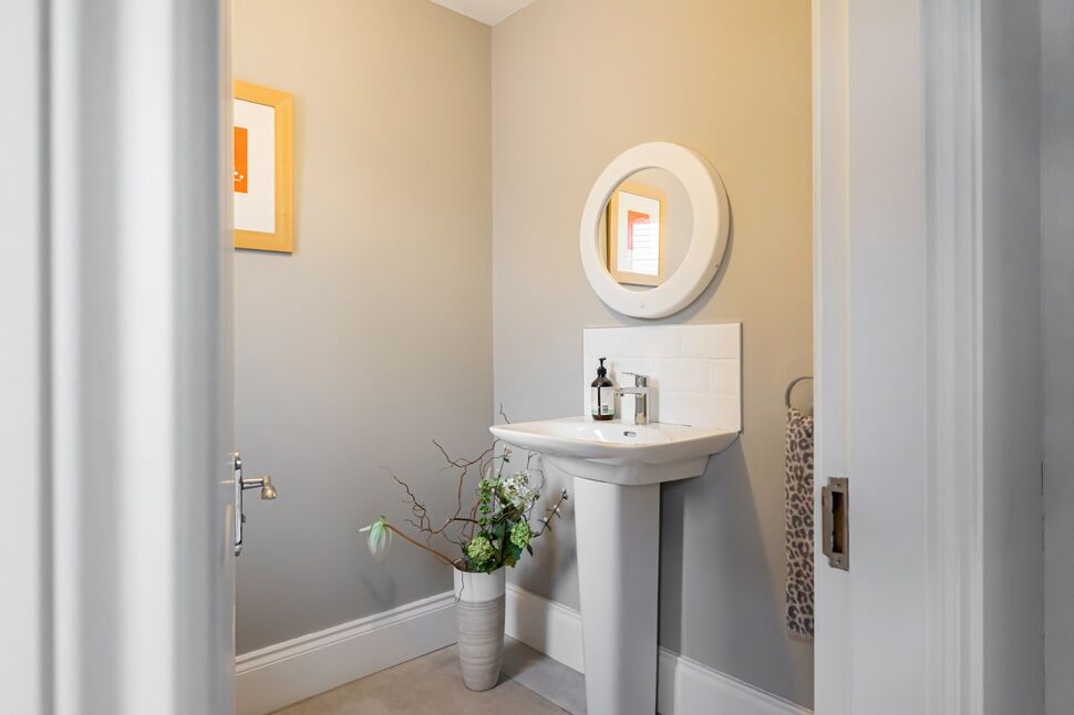 White suite comprising: Pedestal wash hand basin with mixer taps and tiled splashback, low flush WC, stone tiled floor, extractor fan.
