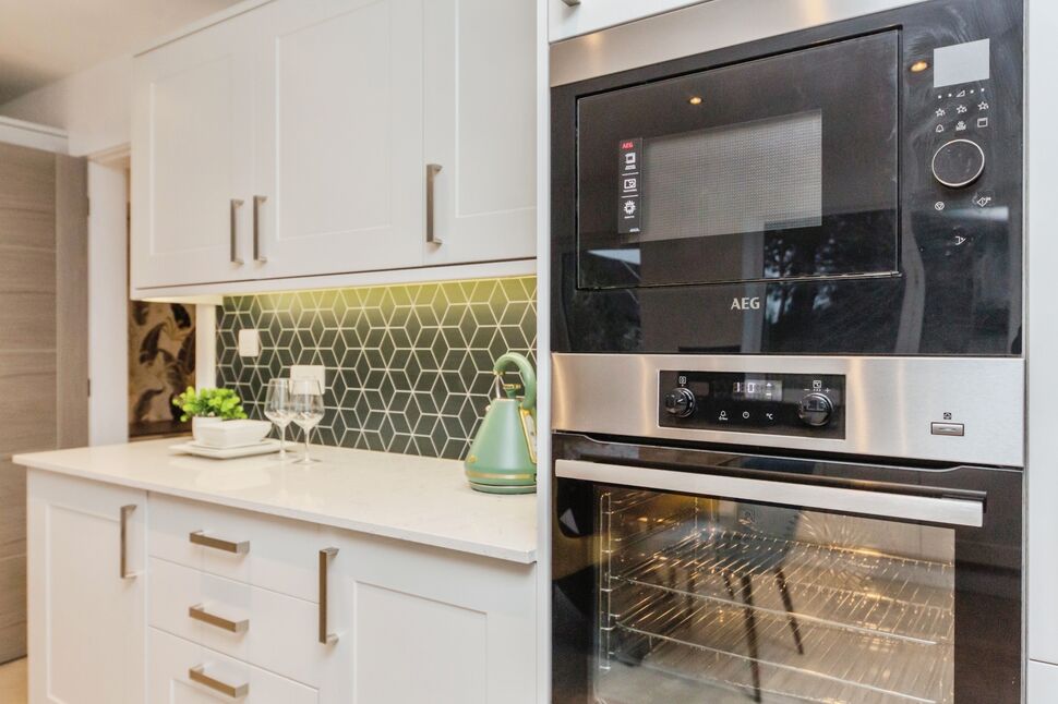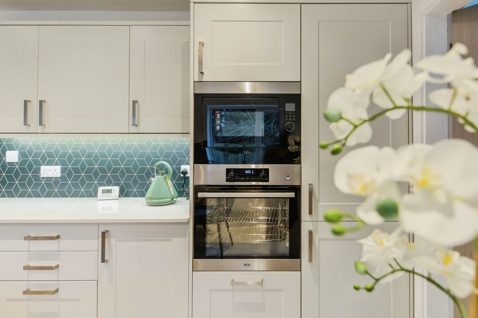 The main hub of the home, which has been cleverly designed to accommodate maximum cupboard and work surface space along with floor space to accommodate dining furniture as well. The kitchen area consists of a comprehensive range of Shaker style base and wall units with Quartz work surface over and inset engraved drainer along with inset sink unit and mixier tap, complementary mosaic style tiling to walls, integrated appliances consist of AEG dishwasher, fridge freezer, Steam Oven, microwave and induction Hob with extractor hood over, LED pelmet lighting under wall units, inset LED spot lights to ceiling throughout, double glazed window and double doors both to the rear elevation over looking and enabling access to the garden, concrete style porcelain tiled flooring continuing from the entrance hall.