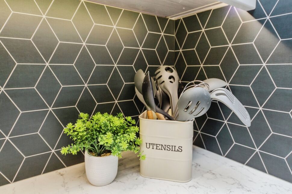 With matching shaker style base and wall units with work surface over and inset Stainless Steel sink unit with drainer, space and plumbing for washing machine, Lamona Wine cooler, wall mounted Baxi combi boiler, double glazed window to the side elevation, tiled flooring, inset LED spot lights to ceiling and access through to the cloakroom/WC.