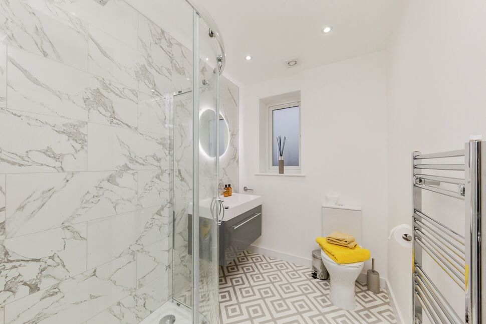 A modern three piece suite consisting of a walk in double shower cubicle, low level WC and vanity wash hand basin with floating cupboard beneath, decorative tiled walls, inset LED spot lights to ceiling, Chrome towel radiator and double glazed window to the rear elevation.