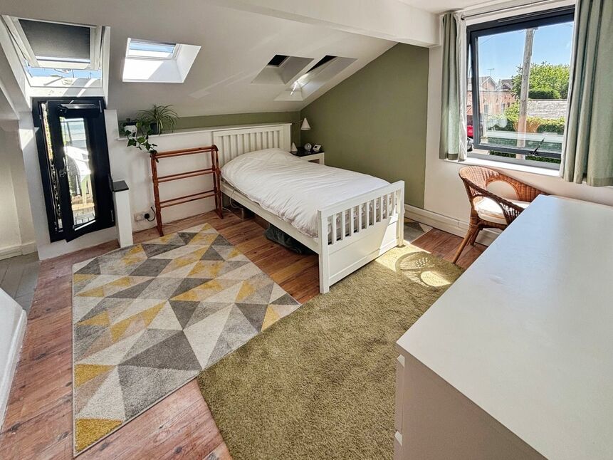 Fitted storage cupboards. Wooden flooring. Wall mounted Modern radiator. Velux windows. Low level door to Own private balcony.