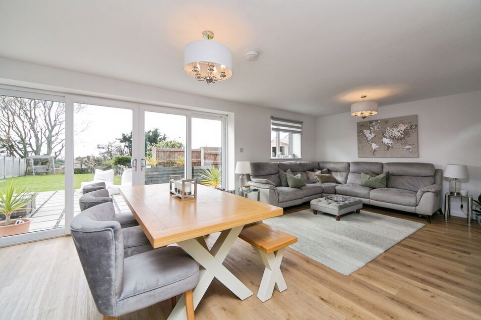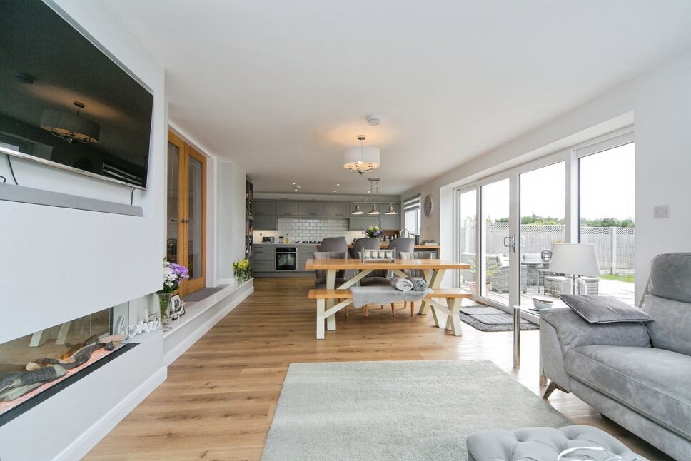 Kitchen - Fitted with a range of modern wall, drawer and base units with worktop over, one and a half stainless steel sink with drainer, integrated dishwasher, integrated double oven, void for free standing American fridge freezer, Quooker instant hot tap, underfloor heating, power points, tiled splashbacks, breakfast bar with stool space with a uPVC double glazed window to the side and rear elevation.Dining/Living Area - Having space for a good size dining table & chairs, uPVC double glazed sliding doors, uPVC double glazed window, inbuilt feature electric fireplace, power points, underfloor heating and inset LED lighting. Storage Cupboard (Located off the Kitchen) - Having inset LED lighting, power points and a uPVC double glazed window to the side elevation.