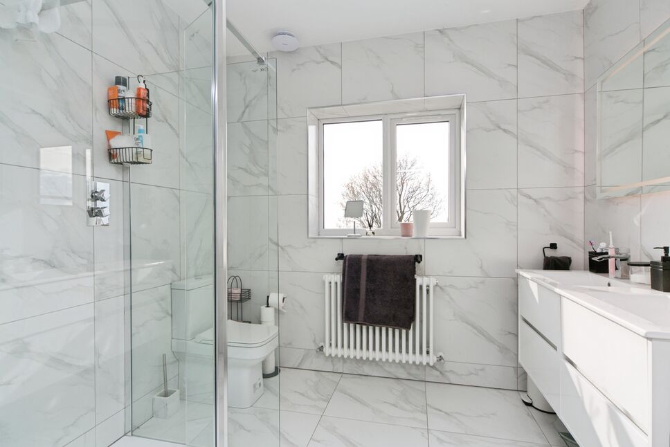 Having a white low flush W.C, vanity hand wash basin, bath with telephonic shower head, walk in shower enclosure with shower unit overhead, radiator, tiled wall,s inset LED lighting and a uPVC double glazed obscure window to the side.
