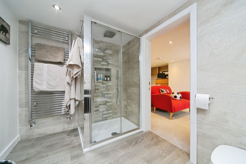 The layout here consists of a double bedroom with a modernised three piece shower en-suite, and the beautifully laid out, open plan kitchen/dining/living room which is perfect for entertaining in large number with sliding doors opening up into the wonderful rear garden.