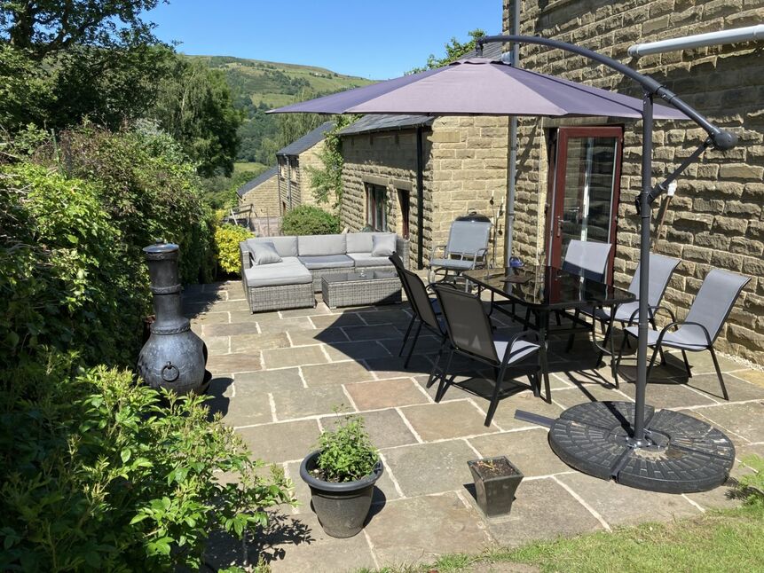 A large wrap round garden, with lawned and patio areas. Extremely private and quiet enjoying wonderful views. There are 2 blossom trees to the front aspect and an apple tree in the back.