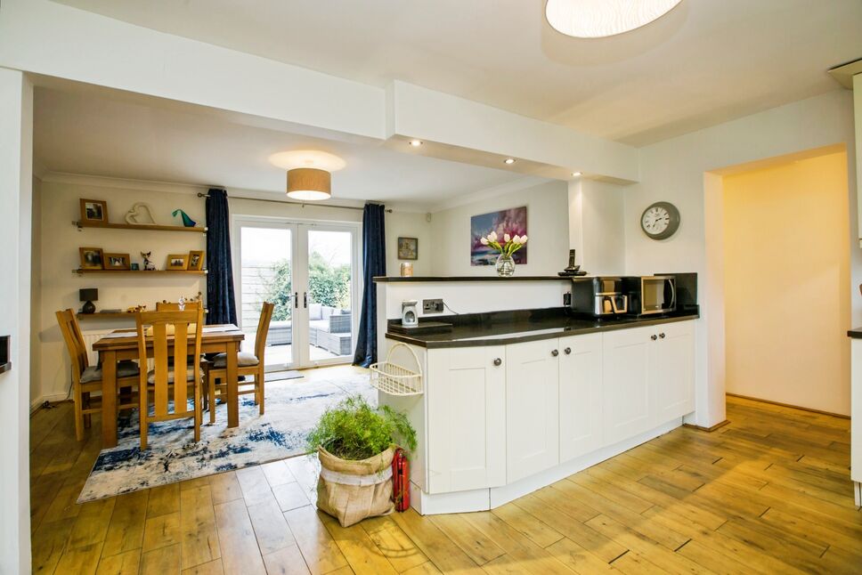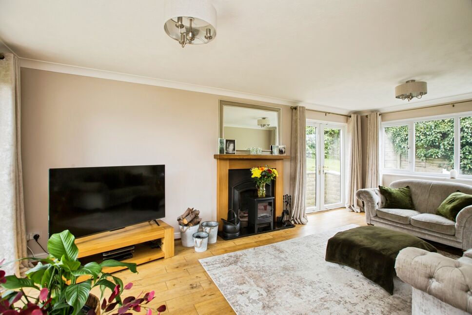 A spacious, bright room with triple aspect windows and patio doors leading onto the wrap around garden. Featuring a bespoke solid oak fireplace, with granite hearth, to compliment the oak floor and doors.