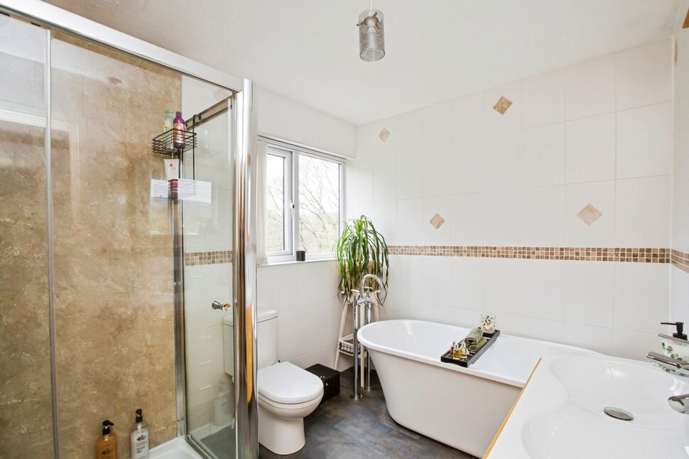 A large fully tiled bathroom, with large walk in power shower, w/c, double sink and free standing bath. Again with beautiful countryside views.