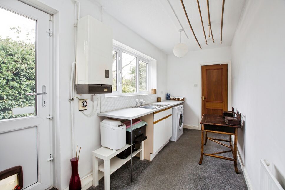 Fitted for a washing machine, with excellent storage and space for extra white goods. There is a large store cupboard and a door leading out onto the second patio area and garden.