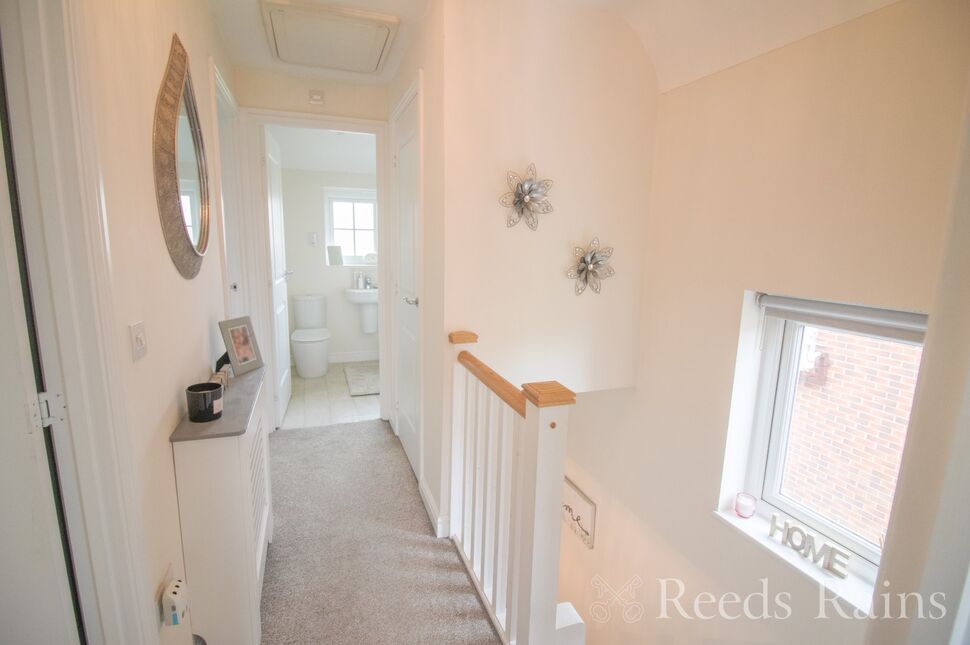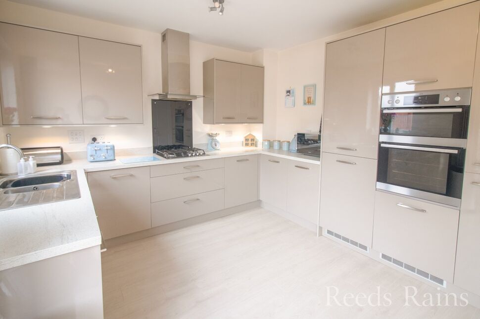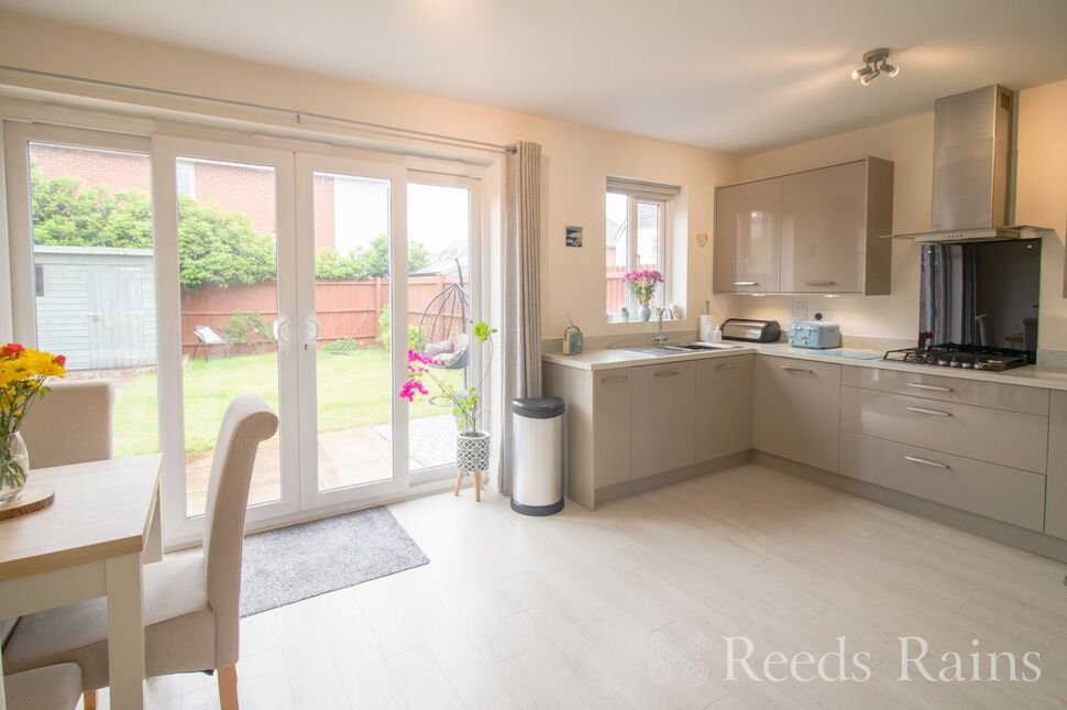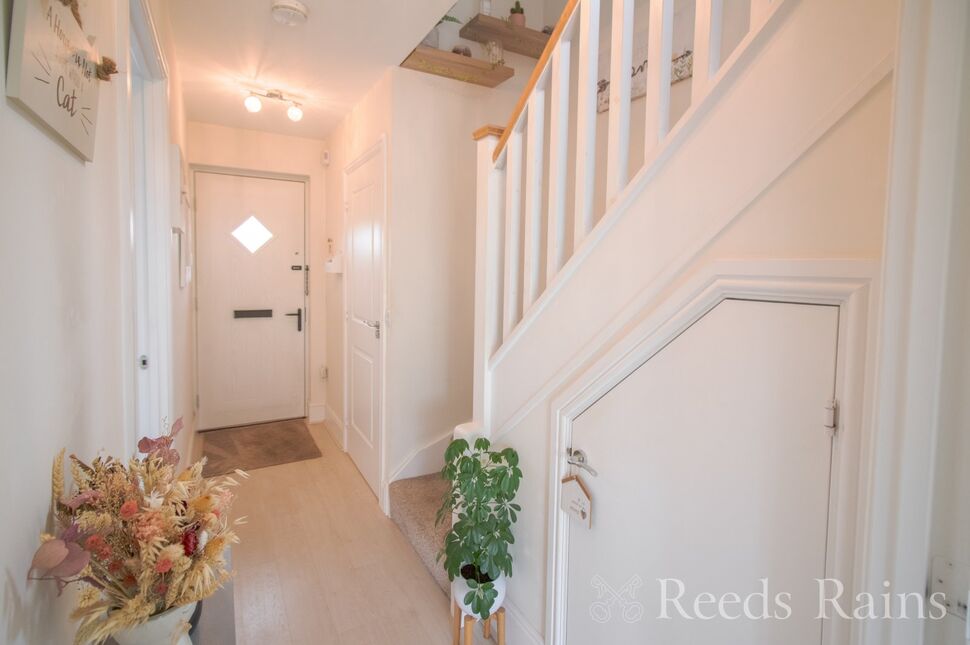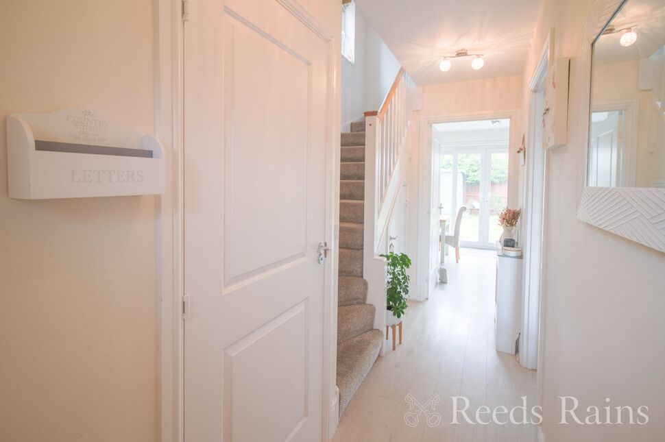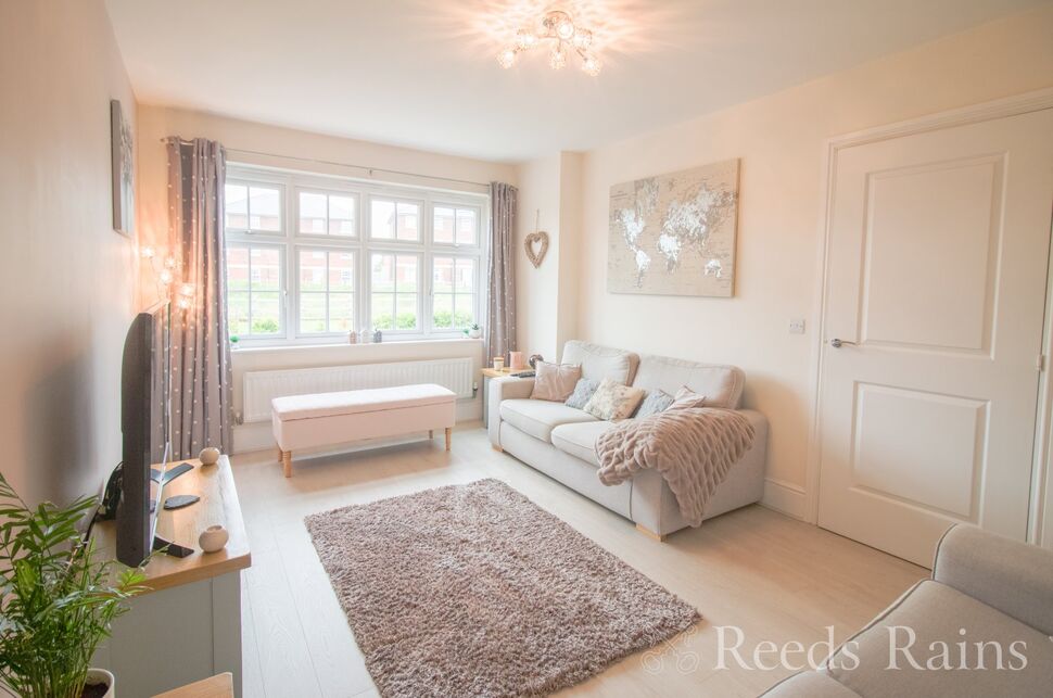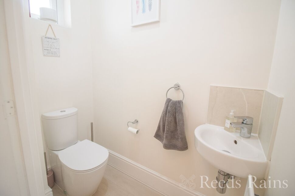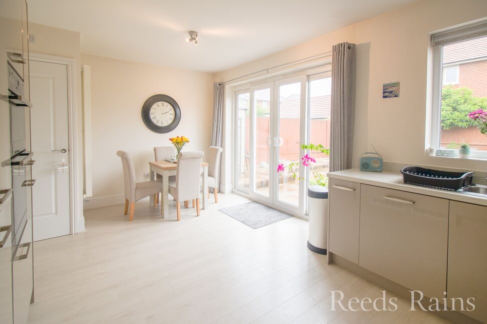 As you step inside you find a bright and airy entrance hall, with handy WC and stairs to the first floor. The neutral walls offer a calming backdrop, setting the tone for the rest of the house. To the right of the hallway is a spacious living room, the large front window lets in plenty of natural light, giving the room a warm, inviting feel with ample space for a big sofa and your favourite entertainment setup. This room has a lovely view over the green space to the front of the property. The heart of the home is the open-plan kitchen and dining area, ideal for family meals and entertaining friends. The kitchen is fitted with plenty of units and matching worktops.