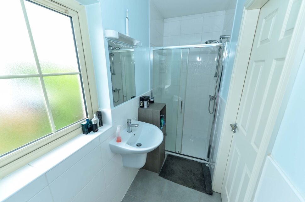 White suite, fully tiled built in shower cubicle with thermostatically controlled shower, semi pedestal wash hand basin with mixer taps, dual flush close coupled WC, half tiled walls, recessed spotlights, ceramic tiled floor.