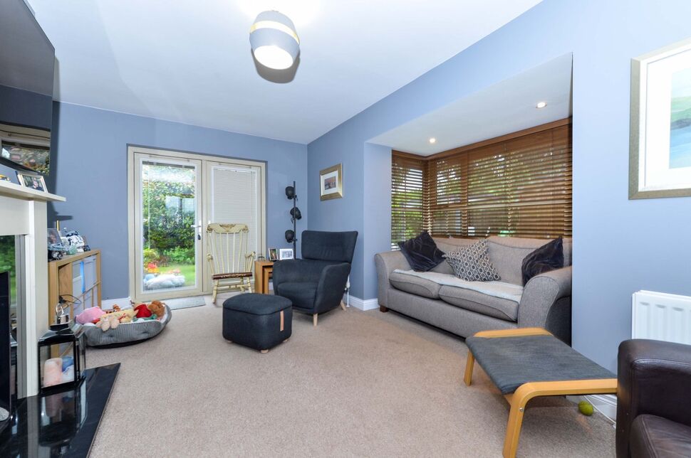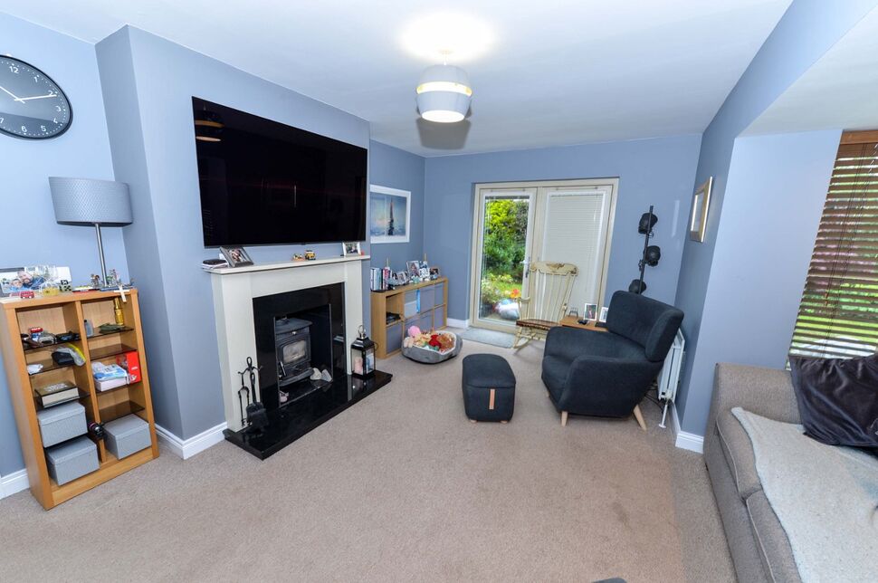 Fireplace with marble inset and hearth, wood burning stove, square bay, double glazed French doors to rear garden.