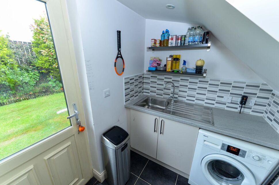 Single drainer bowl and one half stainless steel sink unit with mixer taps, excellent range of high and low level units, tiled splash back, concealed lighting, ceramic tiled floor, integrated dishwasher, integrated fridge freezer, stainless steel built in oven and four ring gas hob, stainless steel chimney extractor fan, recessed spotlights, ample dining and family area.