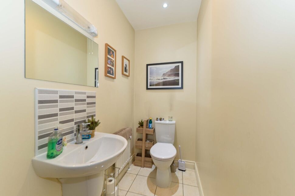 White suite, wash hand basin with mixer taps, dual flush close coupled WC.