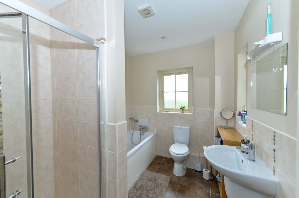 White suite, tiled panelled bath with mixer taps and telephone hand shower, tiled splash back, ceramic tiled floor, dual flush close coupled WC, semi pedestal wash hand basin with mixer taps, recessed spotlights, half tiled walls, fully tiled built in shower cubicle with thermostatically controlled shower.