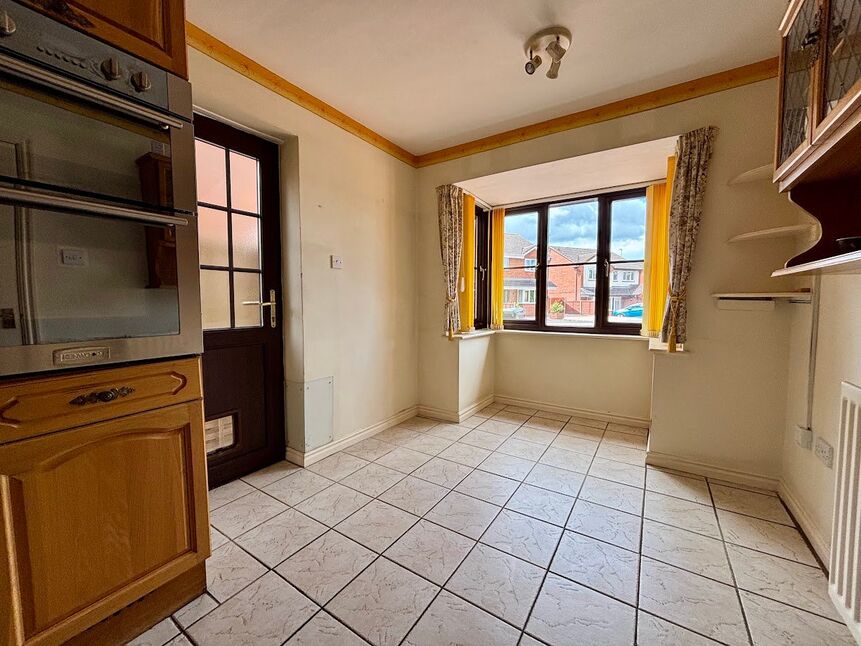 The kitchen features a host of wall and base units, with dining area featuring a bay window flooding the room with natural light. An external door opens to the side passage leading to the rear garden.