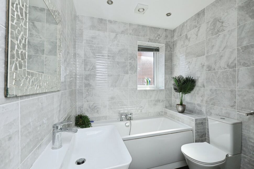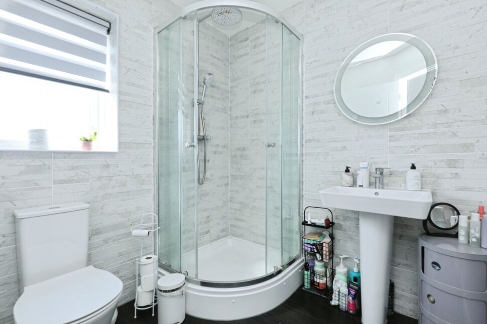 Briefly comprising; panelled bath, separate shower cubicle, hand wash basin, W.C, extractor fan, shaver point, central heating radiator, fully tiled walls, black ash Lavantolaminate floor covering, LED spotlights to the ceiling and side facing double glazed obscure window.
