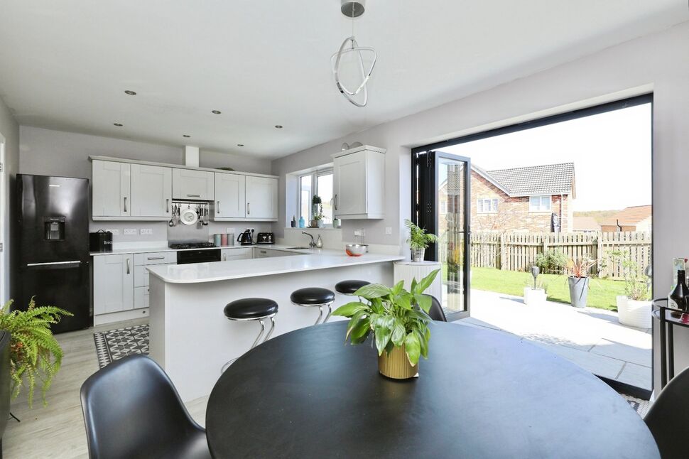 Stunning Symphony kitchen diner comprising of a range of bespoke eye level and base units with feature downlighting and plinth LEDs. Quartz worktop which extends to the breakfast bar and upstand, and provides an aesthetically pleasing focal point of the room. Sink with one and a half mixer tap and drainer incorporated into the worktop, integrated pyrolytic electric oven, gas hob with extractor fan, stainlesssteel splash back behind, integrated dishwasher and washing machine, fridge space, dining area, central heating radiator, white oak Amtico floor covering, LEDspotlights to the ceiling, rear facing double glazed window and impressive triple bi-folding doors providing easy access to the rear garden.