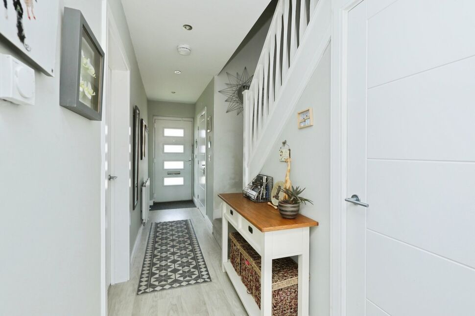 Front facing composite door gaining access to the property, door bell, burglar alarm, central heating radiator, understairs storage cupboard with light inside, white oak Amitco floor covering and spotlights to the ceiling.