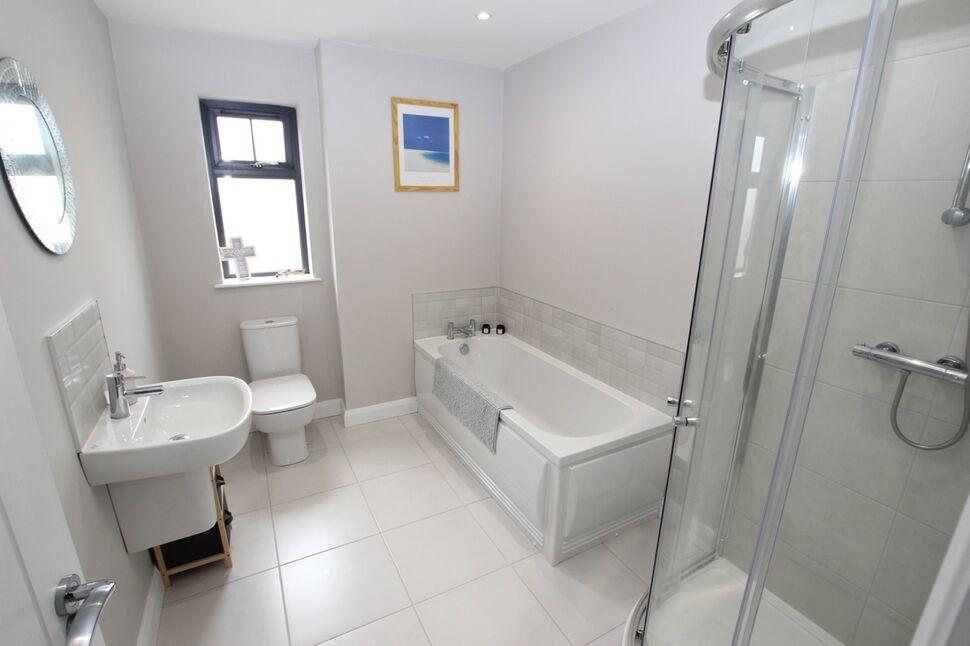 Modern white suite comprising panelled bath with mixer taps. Tiled splash back. Push button low flush W/C and half pedestal wash hand basin with mixer taps. Tiled splash back. Fully tiled shower cubicle with thermostatic shower unit and sliding cubicle doors. Fully tiled floor. Low voltage down lights. Extractor fan.