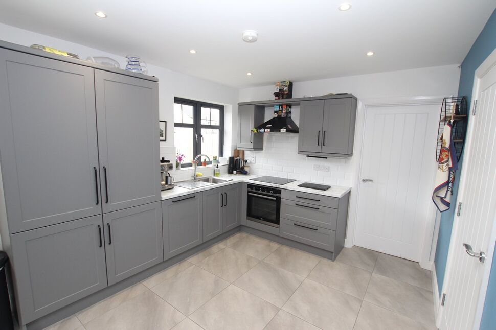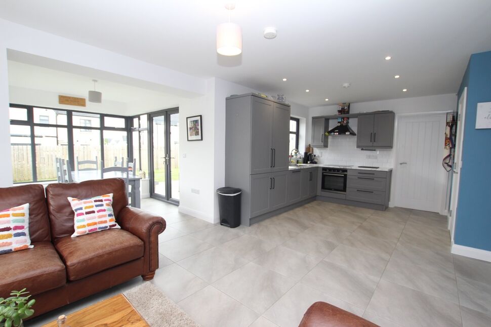 Excellent range of high and low level units with matching worktop surfaces. Stainless steel drainer unit and sink. Integrated fridge freezer and washing machine. Built in touch point hob and oven with extractor fan overhead. Tiled splashback areas. Recessed spotlights. Open plan to ample casual dining / family area.