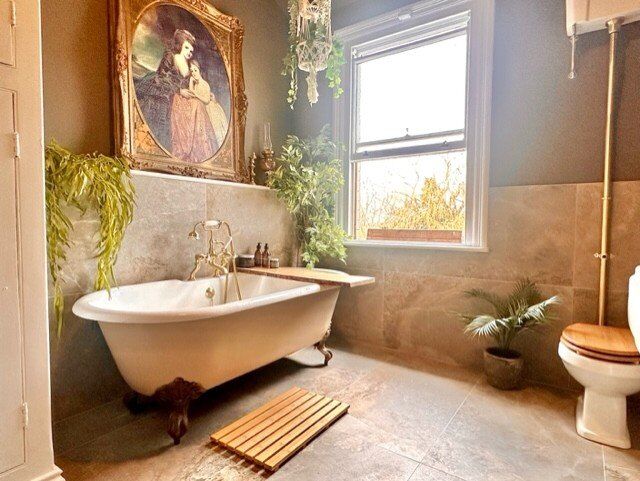 White suite comprising a roll edge ball and claw foot bath with shower fitment to mixer tap and tiled walls and floor. Large Victorian style sink unit and high level flush W.C. Two central heating radiators, built-in storage cupboard, tiled floor and sash window to the rear.