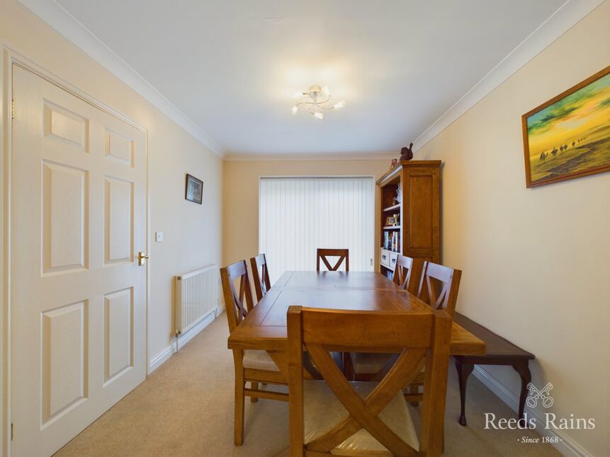 Perfect for entertaining or family gatherings, the dining room benefits from garden-facing double-glazed sliding patio doors, seamlessly blending indoor and outdoor living. Ceiling coving adds a touch of sophistication, while a radiator ensures comfort. A connecting door leads directly into the kitchen.