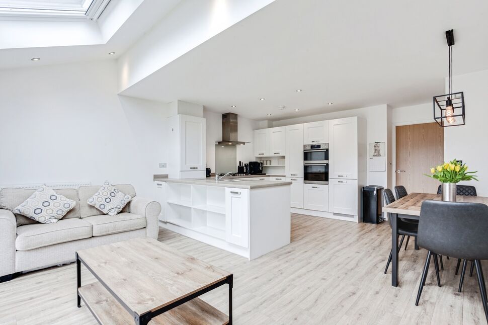Open plan space to the rear with laminate floor, gas central heating radiator, three Velux windows and a set of French doors leading out into the rear garden. The kitchen section of the room is fitted with wall and base units, 1 1/2 stainless steel sink/drainer and laminate worktops. With integrated appliances such as; double oven, five stove gas hob with cooker hood over, fridge/freezer and dishwasher.