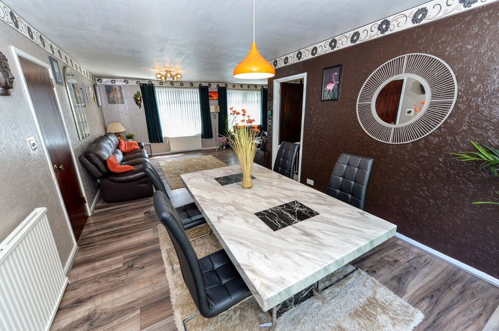 At widest points. Original fire place with tiled hearth. Ample dining area. Laminated wooden flooring. uPVC sliding door to enclosed rear garden.