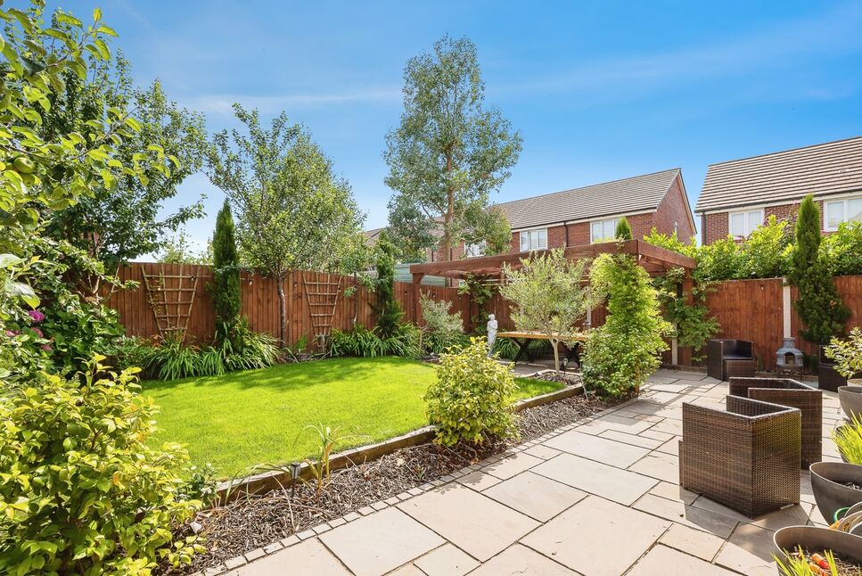 The property is situated on a larger than average plot in a quiet corner of this stunning development. To the front the garden has a large driveway providing ample off road parking for 6-7 vehicles or camper van / work vehicle / motor home type vehicles. There is bin storage behind garage. To the side and rear of the property are stunning well maintained gardens providing the perfect place for outside dining and entertaining family and friends. There is a Pizza oven and BBQ area that is flagged with Pergola making this a fabulous place to whip up a superb relaxed evening. To the rear the garden is mainly laid to lawn with flowers, trees and shrubs planted throughout with a further flagged seating area to be able to enjoy the warm summer evenings. It is a stunning garden that really needs to be viewed to appreciate.