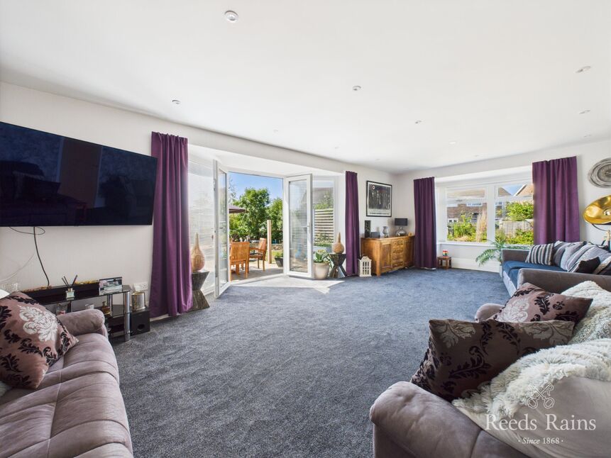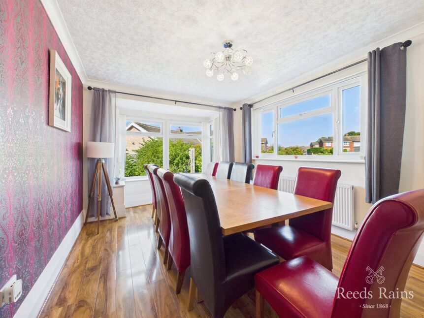 The lounge is a striking and comfortable living space, beautifully bathed in natural light. It benefits from two elegant bay windows, one of which features French doors that open directly onto the garden—perfect for seamless indoor-outdoor living. The dual aspect design not only enhances the brightness of the room but also offers charming views of the garden, making it an ideal space to relax or entertain.