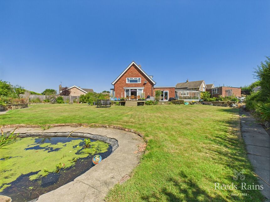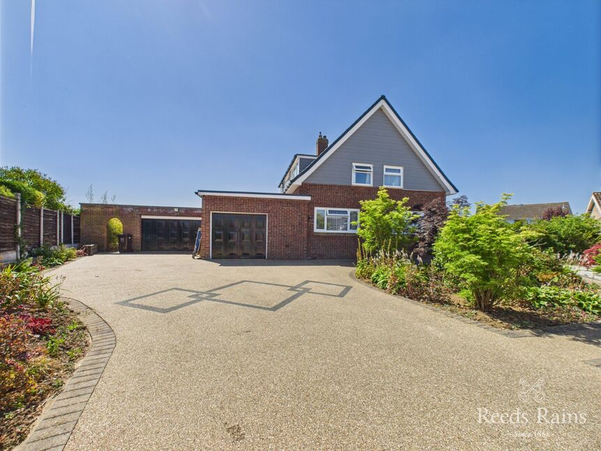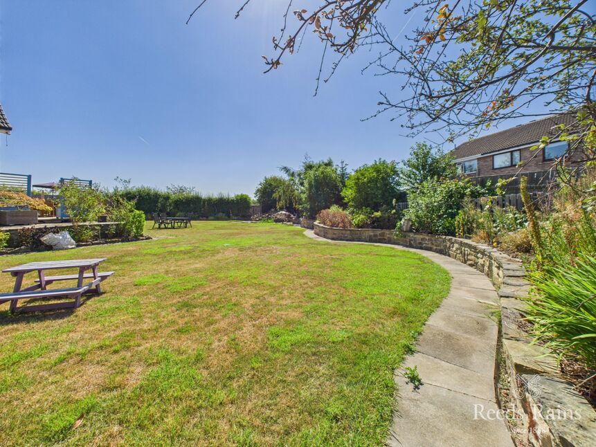 Stepping outside, the property enjoys generous, well-established gardens that provide a tranquil and picturesque backdrop. Set within a plot of approximately one-third of an acre, the grounds feature manicured lawns, raised beds filled with a variety of mature plants and shrubs, and a decked terrace—perfect for al fresco dining or simply soaking up the sun.To the front, a substantial driveway offers ample off-road parking and leads to multiple garages, providing excellent space for vehicle storage, a workshop, or hobby area. These garages also present exciting development potential, subject to the necessary planning permissions being obtained, offering scope for home office space, an annexe, or studio conversion.