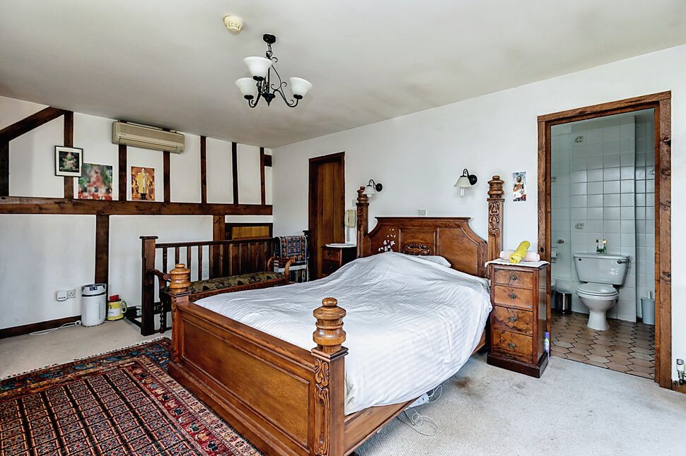 Carpeted flooring. Two double radiators. Beams to walls. Wooden double glazed window to front aspect and wooden double glazed double doors to rear aspect. Built in wardrobe. Door leading to en-suite.