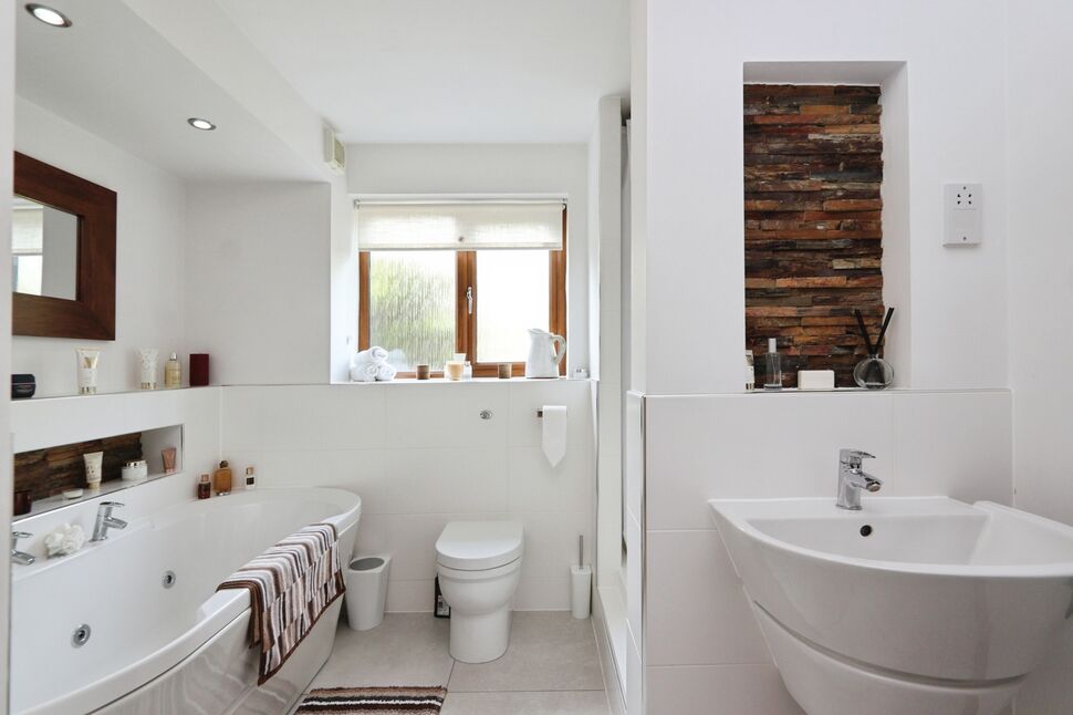 The family bathroom is tiled and fitted with WC, wash hand basin, whirlpool bath, walk-in shower, tiled floor with underfloor heating and side facing PVCu double glazed window.