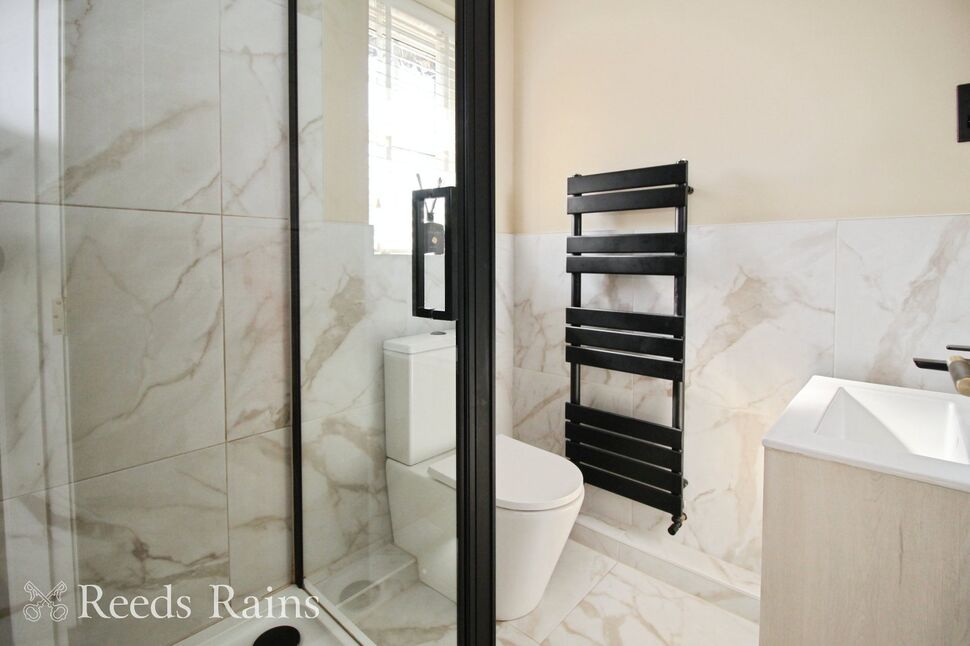 Rear facing double glazed window. Stunning four piece suite comprising freestanding bath with mixer tap and shower extension, hand basin, WC and walk-in shower area. Tiled floor and part tiled walls. Heated towel rail. Extractor fan.