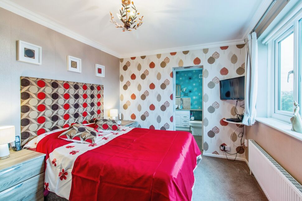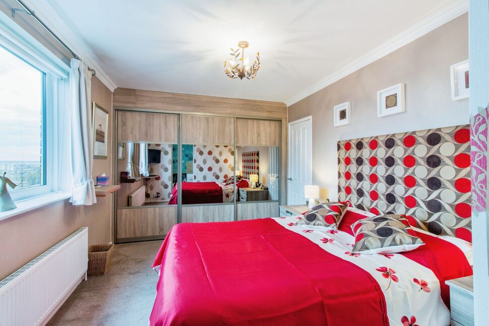 A good size master bedroom having a range of fitted wardrobes and cupboards, central heating radiator and rear facing window with distant views.