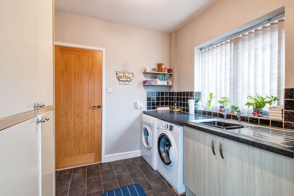 Having fitted base units with inset sink and drainer. Space and plumbing for a washing machine and tumble dryer. Central heating radiator. Side facing window and rear facing exterior door to the garden.