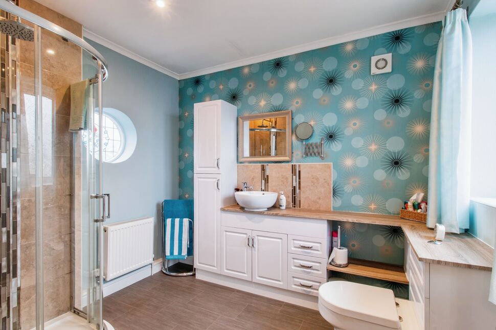 Fitted with a contemporary white suite comprising low flush WC, wash hand basin and panelled bath with shower over. Part tiled walls. Fitted storage and built-in cupboard. Recessed spotlights. Heated towel rail and side facing window.