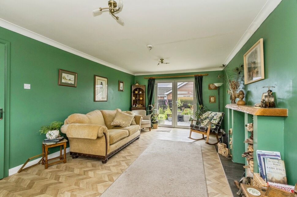Laminate flooring. Feature stove with wood mantle and slate hearth. PVC French doors to rear.