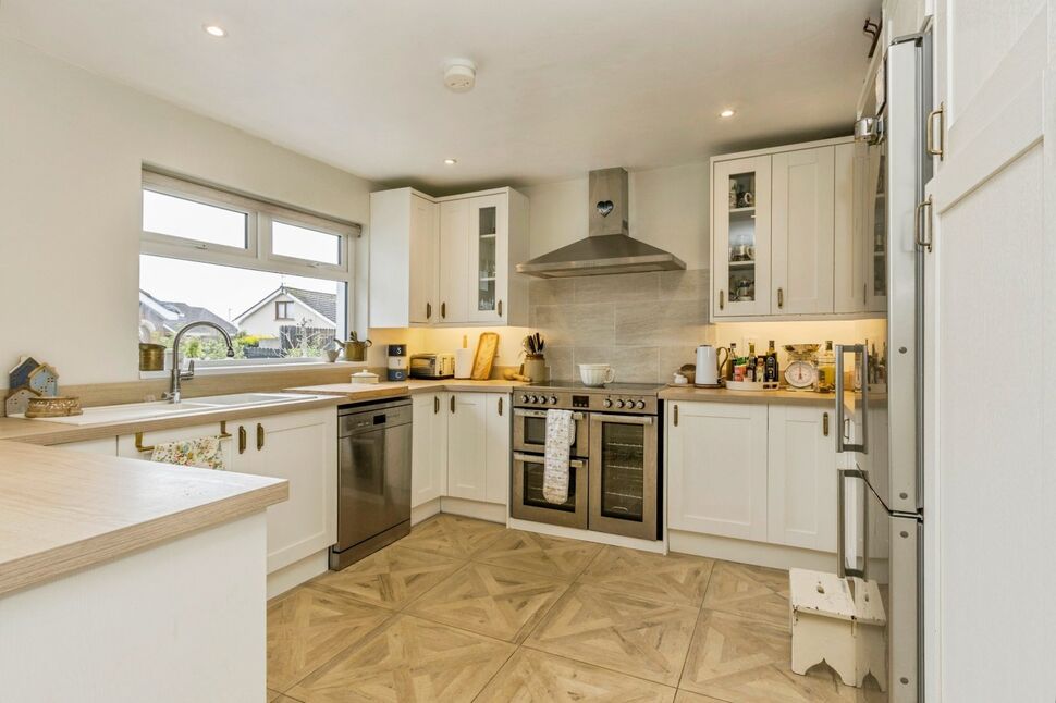 New fitted luxury kitchen with an excellent range of high and low level units and laminate work tops. One and a half bowl stainless steel single drainer sink unit with mixer tap. Space for range style cooker with stainless steel extractor fan. Plumbed for dishwasher. Tiled floor. Recessed spotlights. Open to: