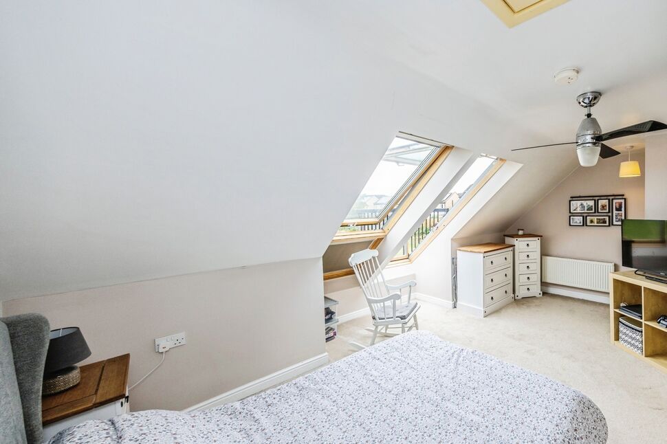 A Superb primary bedroom which is a large double bedroom with built in wardrobes along one wall, an ensuite shower room and two Velux balcony windows.