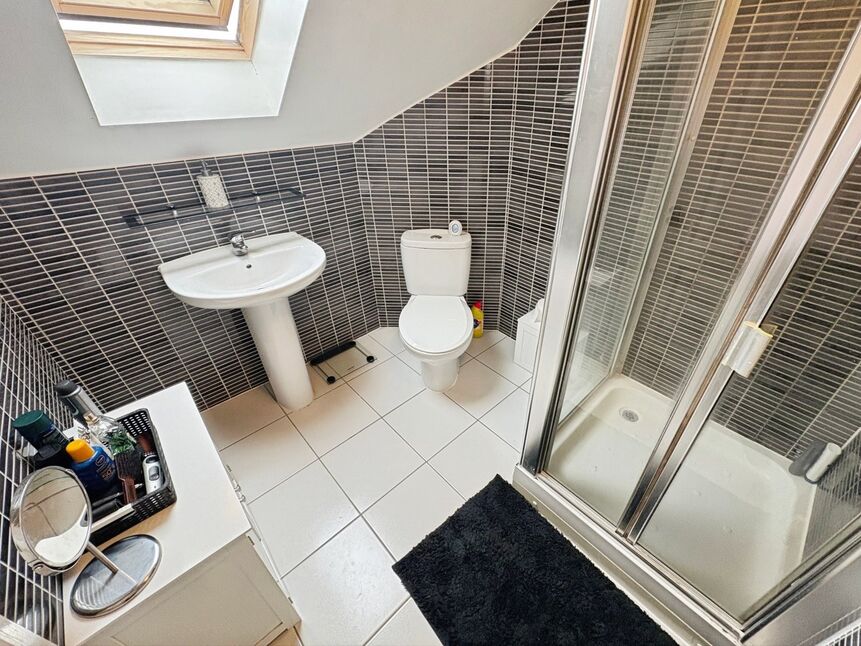 A modern three piece ensuite bathroom, this bathroom has a walk in shower, Toilet and wash basin.