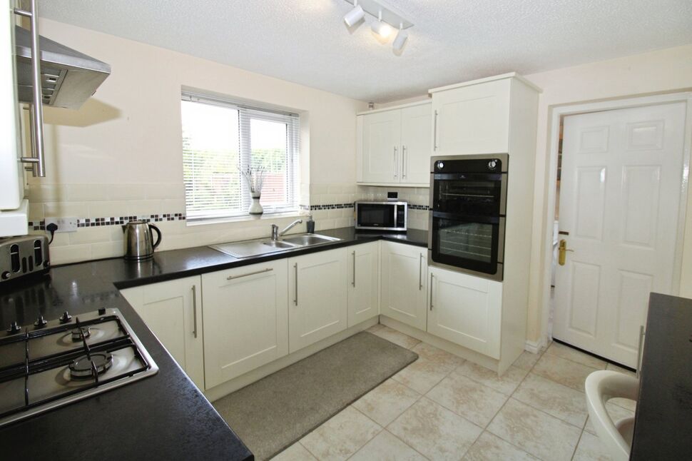 Double glazed window to rear, tiled floor, part tiled walls and refitted with one and a half bowl sink unit with wall and base units, integrated dishwasher, inset gas hob with extractor hood over, inset gas double oven, breakfast bar, radiator, understairs storage cupboard, panelled door to:-