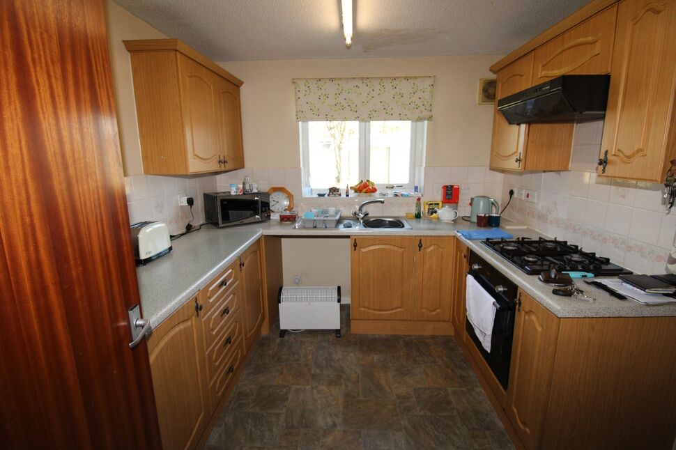 Double glazed window to rear, matching wall and base units with work surfaces over, sink unit with mixer taps over, integrated four ring gas hob, oven and extractor fan over, space for fridge/freezer.