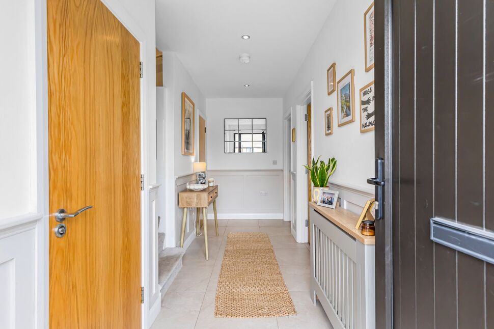 A large entrance hall with an under-stair storage cupboard and downstairs wc. The hall has a tiled floor, wall panelling and ceiling spotlights.
