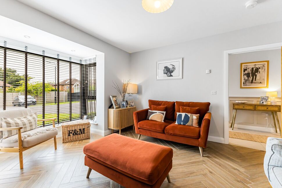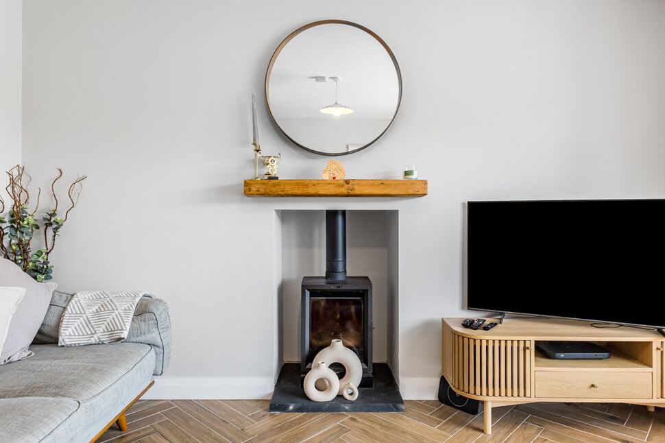 A bright living room with herringbone tile flooring, bay window and multi-fuel stove.