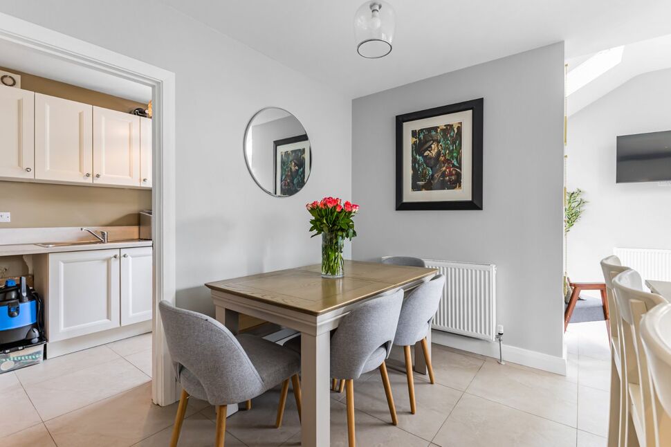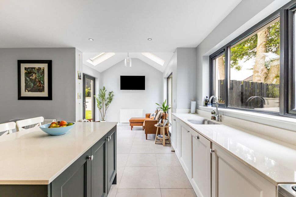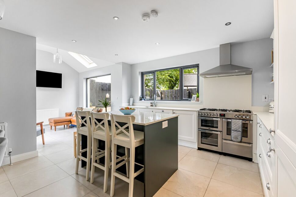 A stunning kitchen and dining space with an excellent range of high and low level units, and integrated appliances to include the fridge freezer, dishwasher and eight ring gas hob and oven. There is also a stainless steel extractor, double basin with swan neck mixer tap, and a central island with seating space and additional units. There is a dual aspect seating area with two bright velux windows, and patio doors which lead to the rear garden.