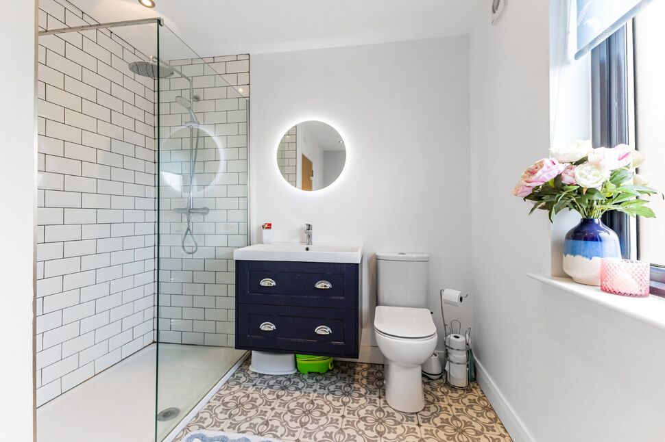 A beautifully finished shower room suite with a low flush wc, wash hand basin with mixer and vanity, and a shower enclosure with a thermo-controlled shower unit. The ensuite has a tiled floor, partially tiled walls and velux window.