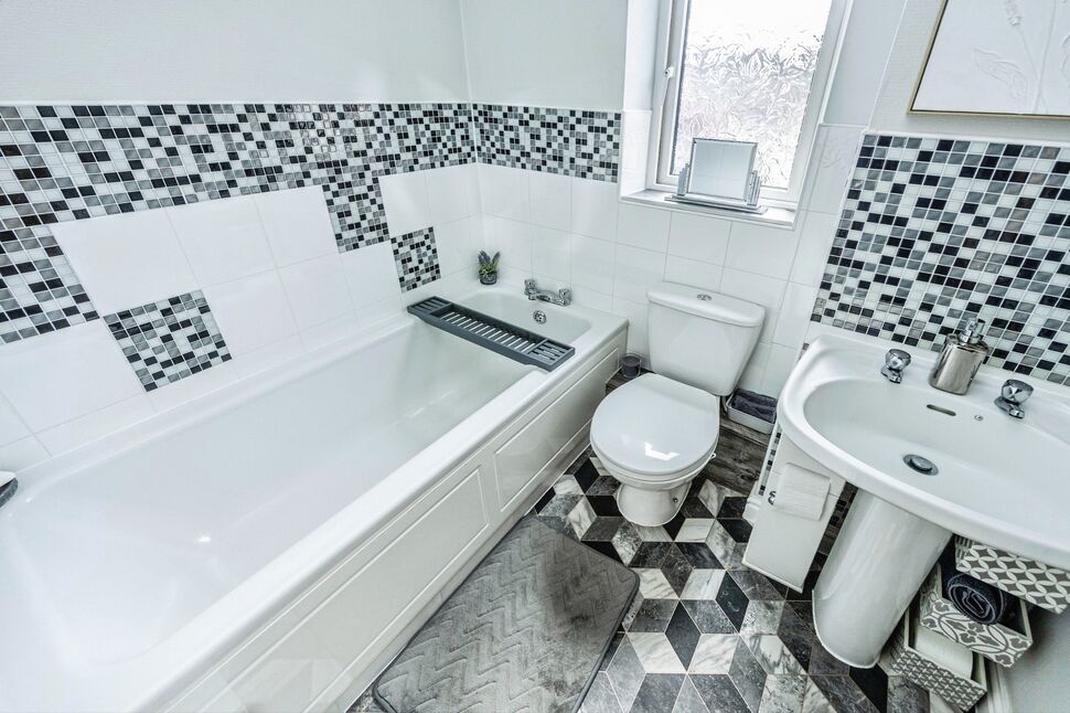 Fitted with a modern white three piece suite comprising panelled bath, low flush WC, pedestal wash basin, a double radiator and a uPVC double glazed window.